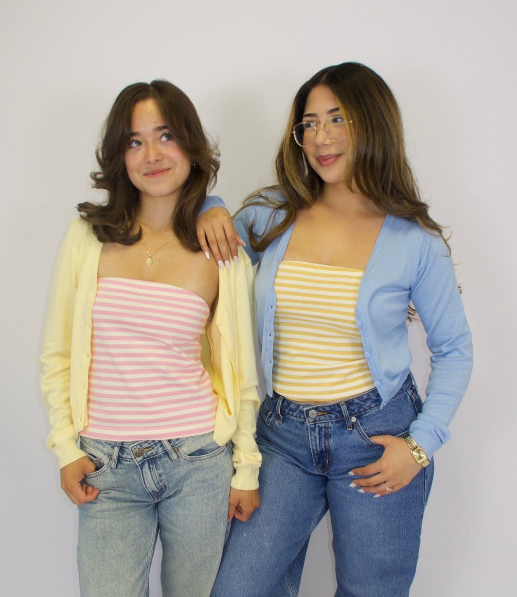 Soft, dreamy, and effortlessly cute 💙💛 This baby blue and baby yellow cardigan is the perfect lightweight layer for any season. Designed with a thin, breathable knit and classic button-up front, it’s made for easy styling and all-day comfort.